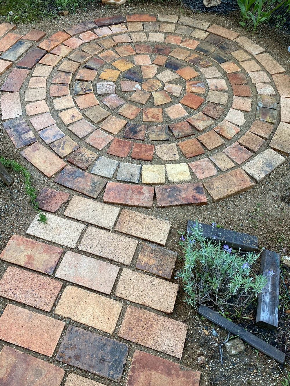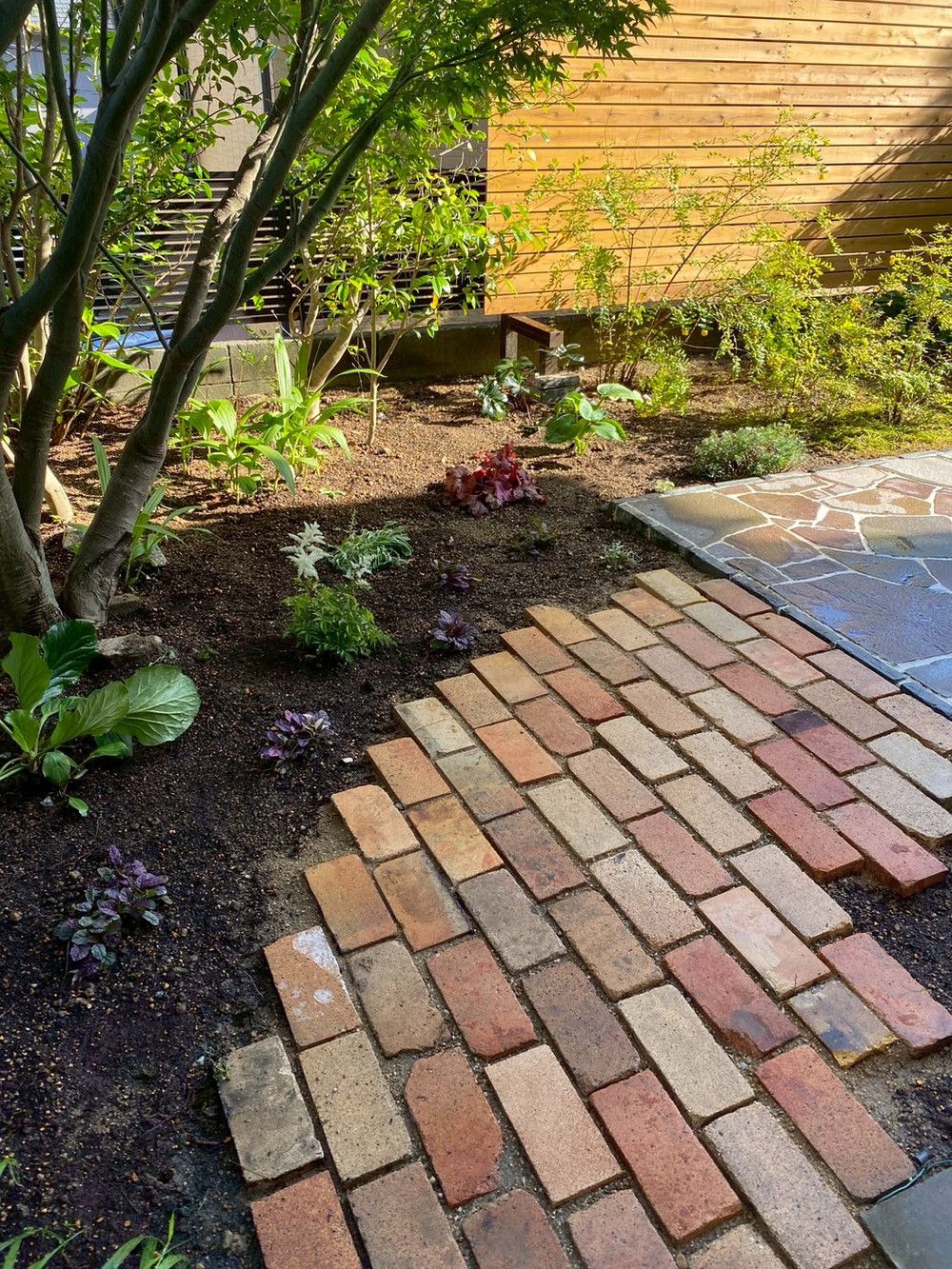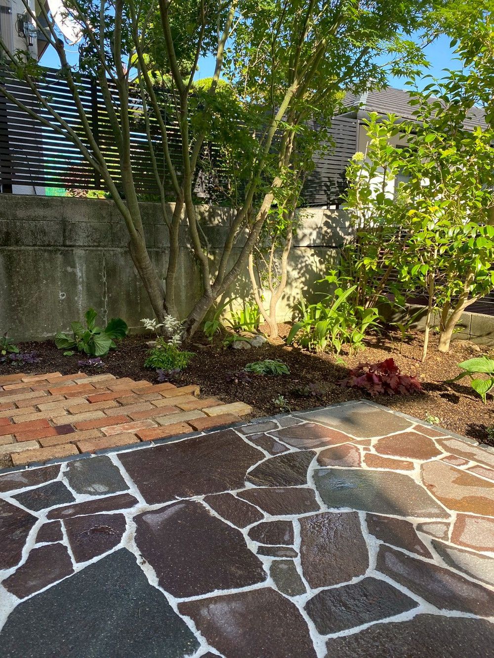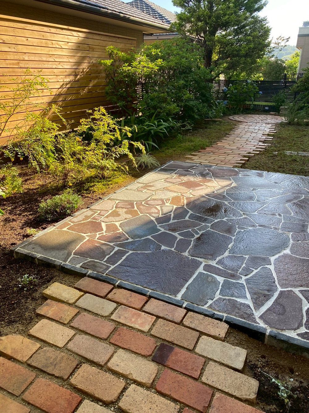 石テラスとレンガの小径