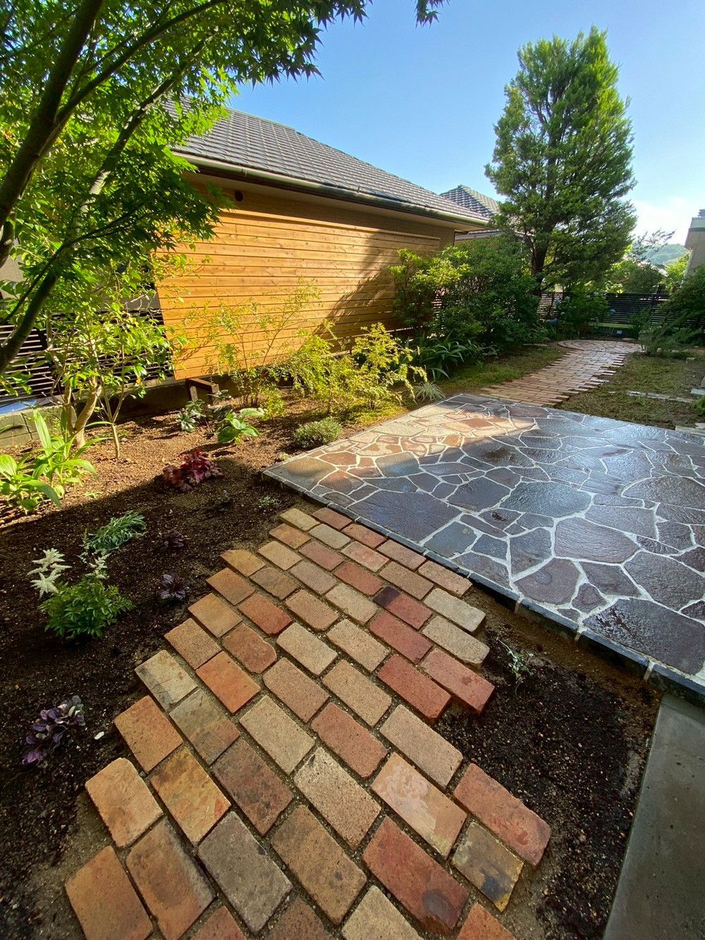石テラスとレンガの小径